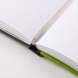 La suave cubierta de fibra reciclada, con bordes redondeados y cierre elástico, le da un aspecto sencillo y elegante.