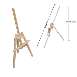 Caballete robusto y estable, elaborado en madera de pino natural, ideal para artistas, estudiantes y aficionados. Al colocarlo de pie alcanza una altura total de 1.55 m, lo que permite trabajar cómodamente lienzos de hasta 52cm de alto.