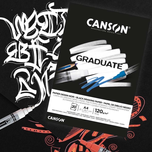 Los blocs Canson Graduate Dibujo Negro ofrecen 20 hojas de papel de color negro intenso de 120 g/m². La superficie lisa del papel es ideal para dibujar a lápiz o con rotuladores. ¡El color negro intenso resalta los colores!